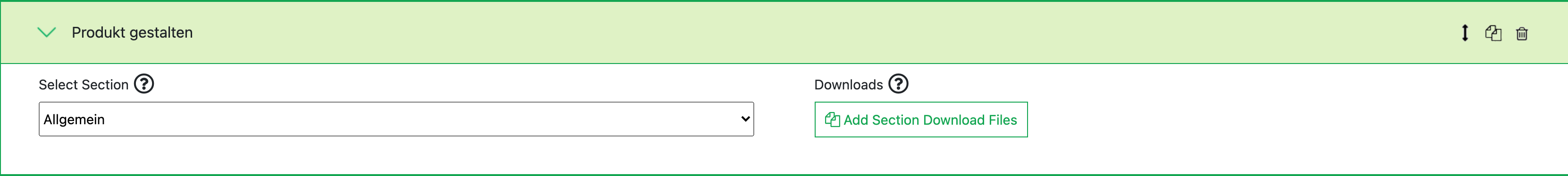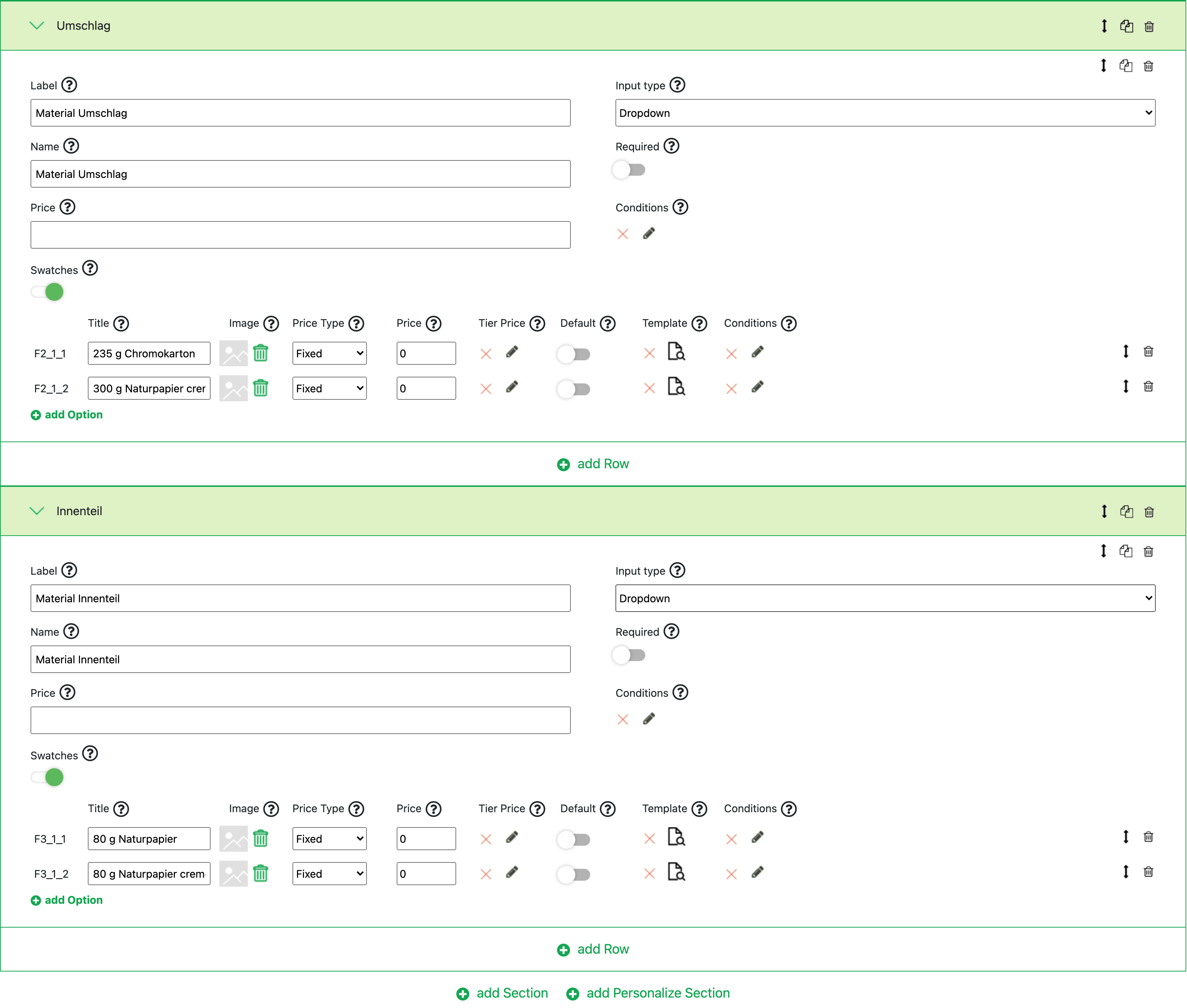 Innerhalb der Section lassen sich dann beliebig viele Optionen hinzufügen. Über die Icons an der Option oder Section lassen sich diese Bewegen, Duplizieren und Löschen. Optionen können auch zwischen den Sections bewegt werden.